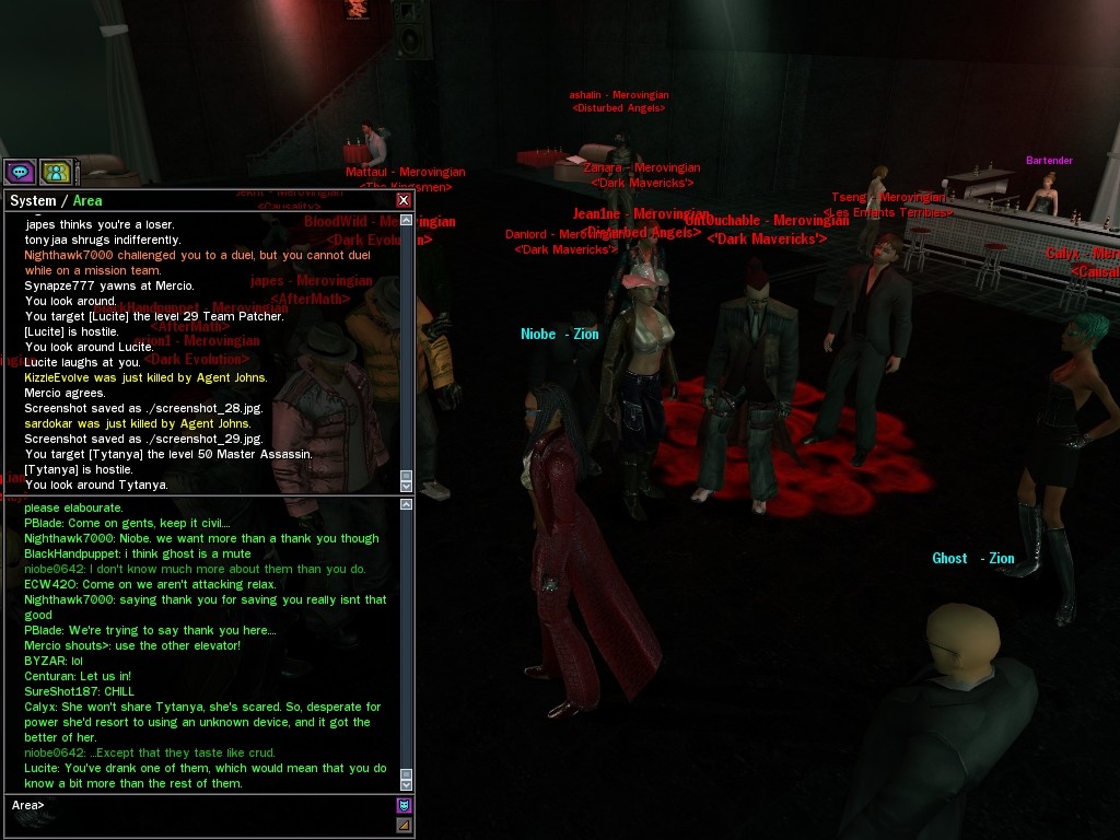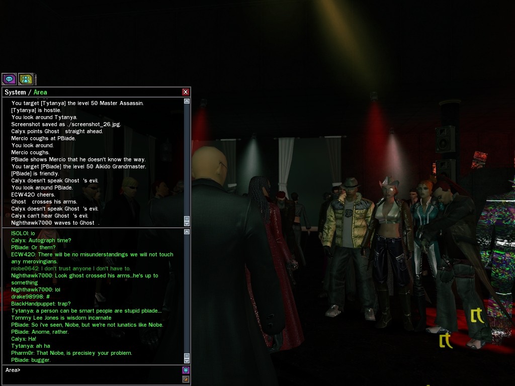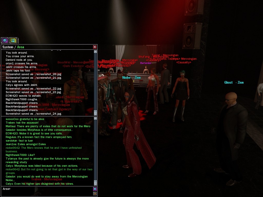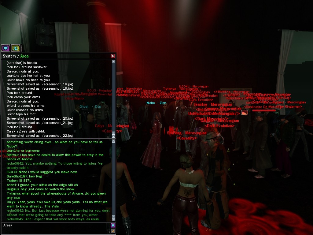 She's going to be the death of me. Just a few days after she's out of Anome's prison, and she wanted to go face about fifty of the top Mervs. "To thank them," she said. "No *CENSORED* way," I told her. "You can barely walk, let alone take on that many of them if something goes wrong." "I won't have to." She smiled at me. "You'll be watching my back." I pleaded with her to let us take more backup into the club, but she wouldn't hear it. Didn't want there to be a chance for some kind of provocation spoiling her meeting. Finally, I had to give in; otherwise she might have gone and tried to do it solo. I'll give them this: they were pretty well behaved. The Merv must have told them to keep their claws sheathed. But some day they'll come out again... I just hope it doesn't happen when I'm standing with Niobe in the middle of a room full of them.