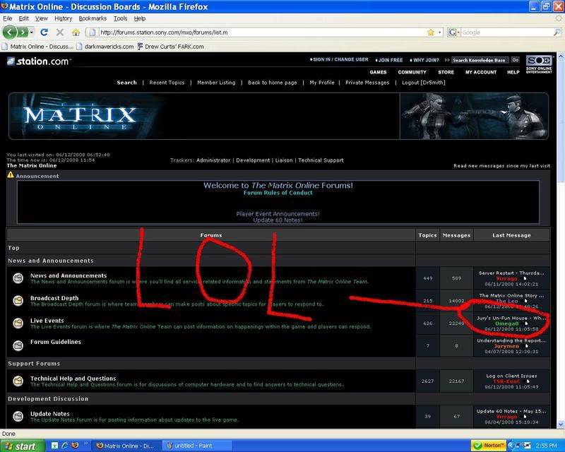 and we just dont want to do that now do we? Why? Well its all been said.... Been here since beta/prelaunch..seen it all...done most and upto about 6 months ago was touting this game all i could since day -whatever!!! But since the changes......ack....dang....*glances at picture...... Meh, maybe SOE's treatment of us has turned me into Hle....er..a bitter old man!! O.o But for some odd reason i'll keep on shelling out $15.00 to them....why?...I dont have a clue really anymore. /EndRantThatWasn'tSupposedToHappen anywho..to the Discussion (gotta have a point don't I?): Has SOE's treatment of the MxO game as a whole changed your attitude about the Matrix in general? Movies, all teh games and such? I'm just down about MxO. I still watch the movies whenever there on and am a huge fan of the story and oh hell I luv the Matrix!!!! I luv my box set with the animatrix, which i luv to watch again and again always picking up on things i missed. PoN and the others i have but havnet played in yrs (as MMO's took over meh LIFE!!) (Gawd! For an old man i'm am sooo lazy on punctuation. /shrug) Doc