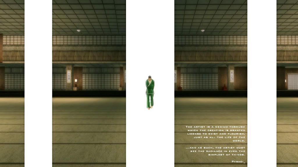 Since Sykin has laid the ground work for enhancing in-game images, *bows to Sykin* I will be augmenting what he has taught, giving you guys things to think about to take your images as far as you want them to go. :smileyhappy: Top get things started, we will take a look at our in-game screenshots and things we can do to enhance them, yielding near photo-realistic effects. For photo-realism, think as a photographer... Personally, I try to be a minimalist when it comes to using screenshots. I think the most important thing to keep in-mind with your stock screenshots is lighting. A well-lit, dynamic image will make things much easier. Light and shading gives things a sense of depth, so look for a good balance before you begin. As Aquatium says in his recent sigs..."without darkness...there is no light." :smileywink: Also, keep the direction of the light, and the type of light (sunlight, artificial light, etc.) in mind when you start. Condensing images... Like Sykin noted in his tutorial, once you've chosen the shot you're going to use, it's a good idea to make the image smaller, taking alot of the pixellation out. This gives you a smoother, easier image to work with. Again, the idea is to get it ready before you really start working. This is the image I will be using in this tutorial: