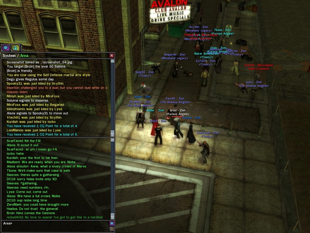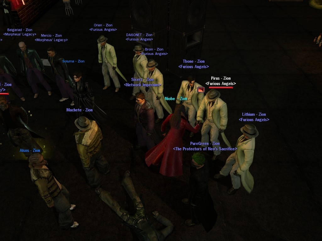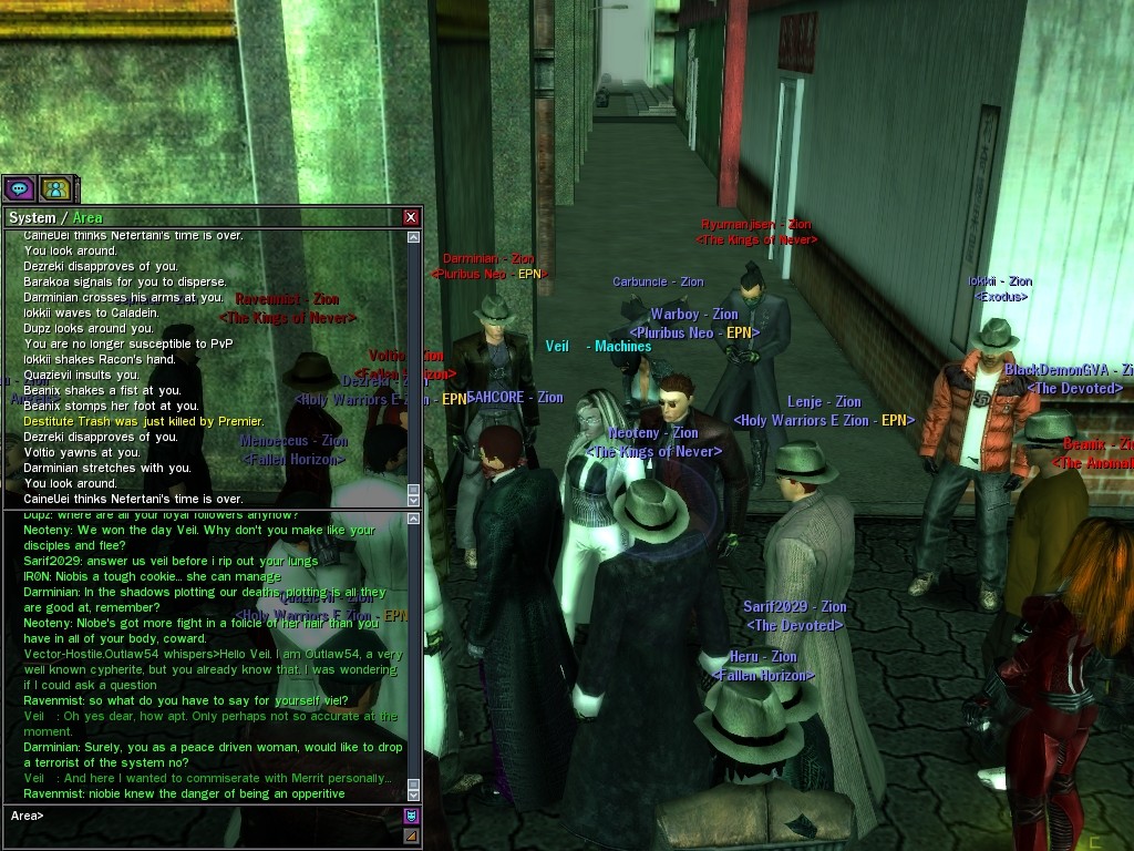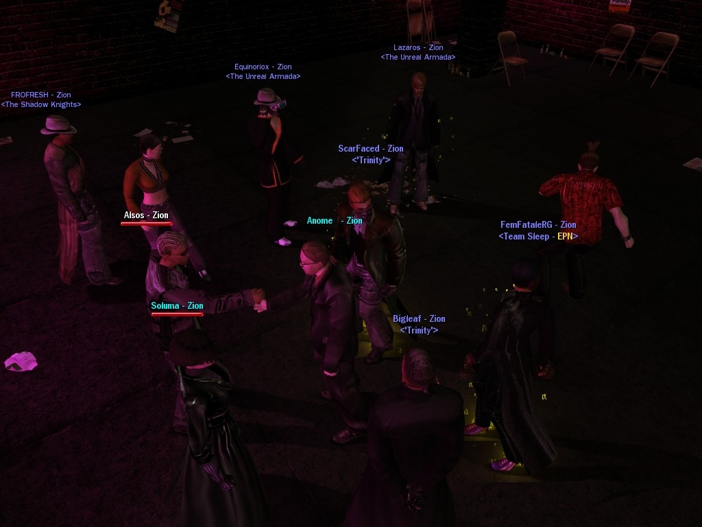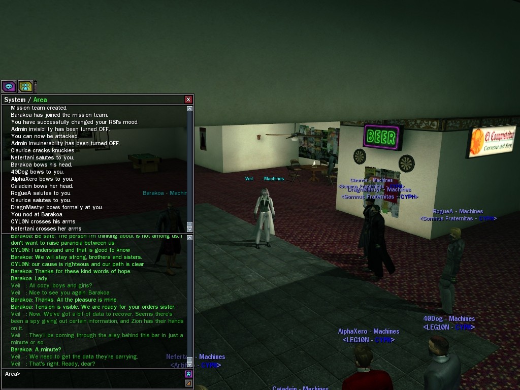 The Exile Eris, identified by transmissions from the Hovercraft Scanline as a member of a group of mercenaries who blackmail redpills, was eliminated by EPN and Zion operatives in Club Deus. The operatives were directed there by one "Sykco," apparently an associate of Unese, the person identified by the public Scanline broadcasts as having access to Eris' whereabouts. Tyndall Mission Control Zion Command