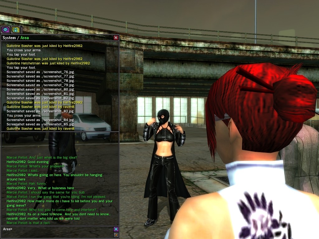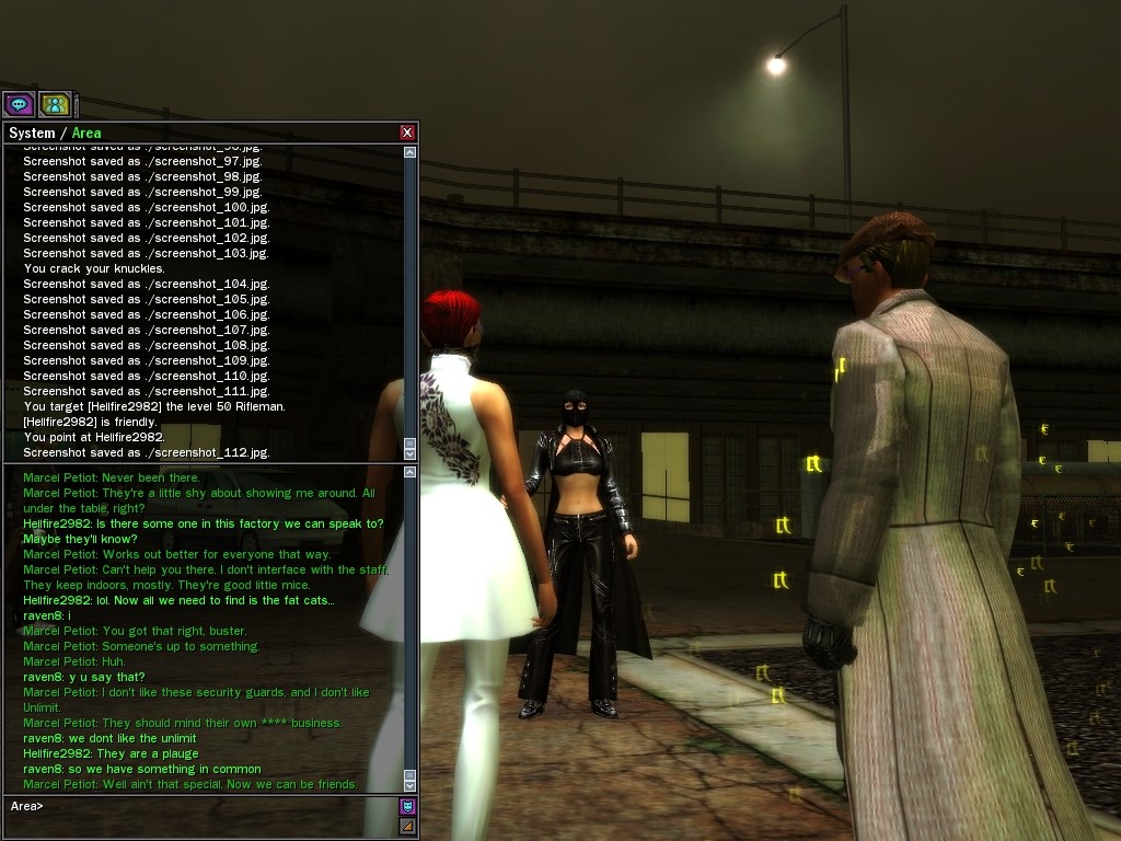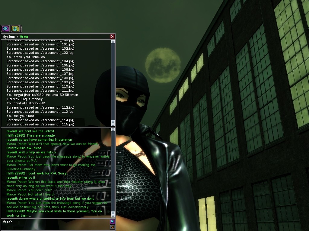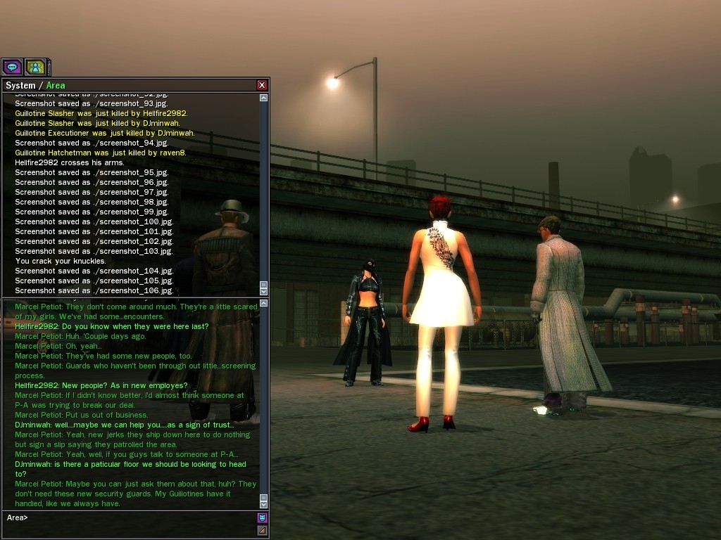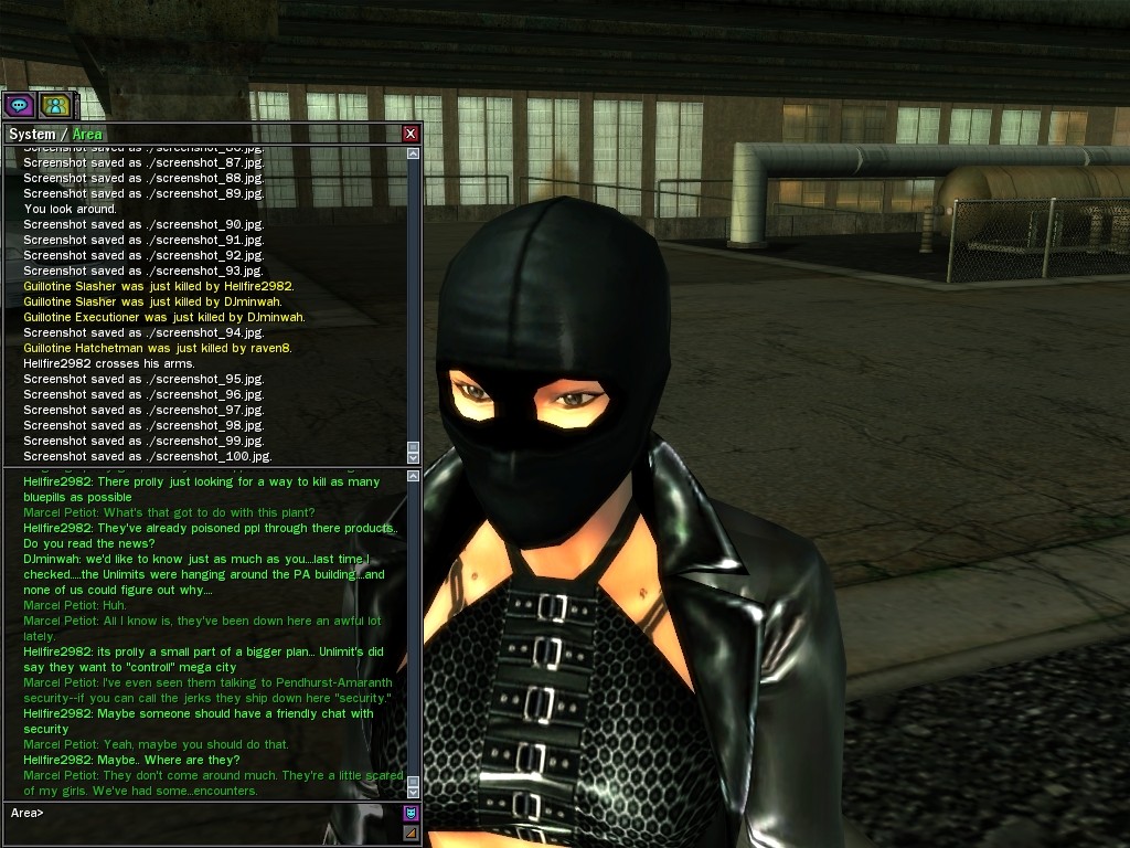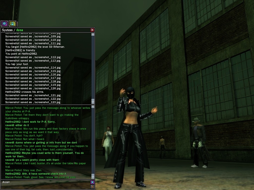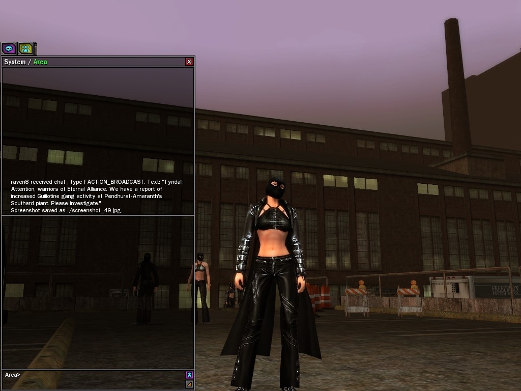 For General Distribution to All Zion Operatives Warriors of the Eternal Alliance faction, responding to an alert of unusual levels of Guillotine gang activity around Pendhurst-Amaranth's plant in Southard, were accosted by the gang's masked leader. She told them that the gang provides security services for Pendhurst-Amaranth's facility in an unofficial capacity, but that this work had been disturbed of late by an influx of new P-A security members. It is unclear what, if anything, this may signify. Operatives are cautioned to keep in mind that the statements of the city's Exile street gangs are often misleading.