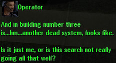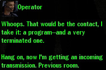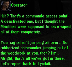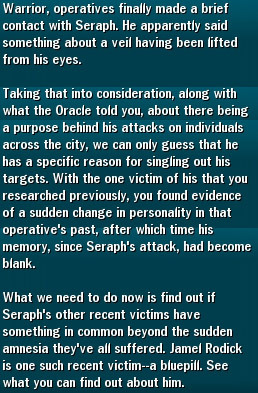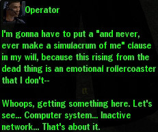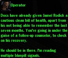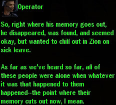 Bauersfelda At first I thought he was lucky--meeting Seraph after only just getting back into the Matrix--but he doesn't remember any of it! Talk about irony... Acrab I don't know what happened... Last thing I really remember before I woke up in Zion a few days was going to investigate one of our terminals in Lamar that had stopped responding. I was on my way there, and then...nothing. That was months ago, now. Coming back into the Matrix doesn't seem to be helping me remember any of it. Gnu Acrab was out of contact for several days on that mission. When we finally tracked down his signal, he was at a nearby restaurant, eating a steak dinner, perfectly calm--didn't remember the mission he was supposed to be on, barely even remembered us, except our names and rank. They put him under observation in Zion for a while, but he seemed fine, if a little pre-occupied. They wanted to put him back on active duty, but he protested: said he didn't feel like he could count on himself in a life-or-death situation. He asked for extended sick leave in Zion, and they gave it to him. But we need experienced soldiers in the field, and he seemed healthy; after four months they revoked his leave, and put him back with us on active duty. Then Seraph ran into him. Aquatium investigating a terminal and then bam, memory loss and personality change, almost like someone else was now in control of them. Its clear something happened, maybe an attack of some sorts, but from what or who.