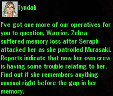 Aquatium Hello Zebra, now let see if we can find out some more intel, what do you remember? Zebra Thanks for coming. The others don't want to talk to me now... They treat me like a stranger. Sorry. The last thing I remember... There isn't much. I was in Camon, about a year ago, trying to keep the Slashers under control. They'd been causing trouble again... I remember searching the back alleys... I saw an Agent standing in a doorway, just watching me--not that I expected him to help. I was... I think I must have been having trouble finding Slashers... The alleys were so quiet...That's all. After that it's blank, except for a feeling of being...lost, I guess. Aquatium An Agent... now that is interesting, something new, I will look into it further, thank you.