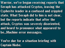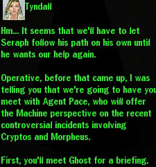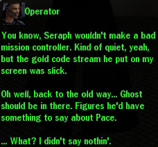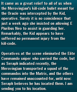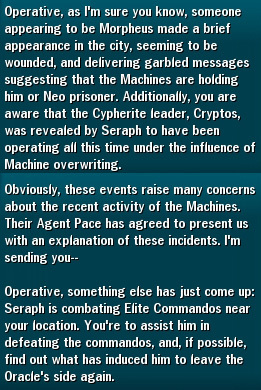 Zion Arbalest I'd make some kind of "rose-colored glasses" crack, but this weather is starting to get to me. Zion Artillerist It's a relief to have Seraph on our side again. He had me worried there for a while, going around beating up operatives and bluepills like that. Aquatium Yes, it is good to have Seraph back..., his new powers certainly are aiding in revealing many truths. Ghost Hello, Aquatium. You'll be working with Seraph to locate Sati. As you've probably heard, Seraph can "see" certain things in the code that most operatives and programs can't, like stealthed Elite Commandos, and Machine overwriting. We aren't sure yet if he can see Sati's code signal, but that's probably one of the things you'll find out shortly. Your operator will tell you where to meet him. Just follow his lead, and I'm sure you'll do fine. Aquatium Will do , Ghost. I left with an urgency that can be described, unless you have been in the same situation.