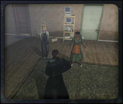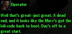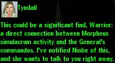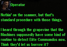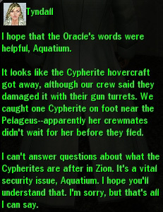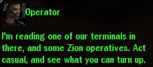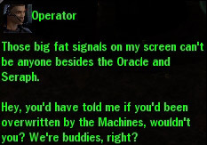 Aquatium Affirmative. I arrived to meet Seraph and The Orcale, and overheard some interesting chatter. Zion Upgrade Artist What do you think the Machines are going to do with Cryptos now that Seraph "outed" him? Do they really want damaged goods on their hands. If they really intended to try patching things up, they'd hand him back over to Zion... Zion Karate Grandmaster I don't know what the Merv is thinking throwing in with that dope, the General, but I enjoy staking vampires at least as much as I do stomping on the General's goose-steppers, so you won't hear me complaining. Zion Physician Oh, yeah, there's big stuff going on back home. Uh... You didn't hear that from me, though. Aquatium Big stuff... I was keen to learn more, but not right now.