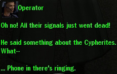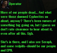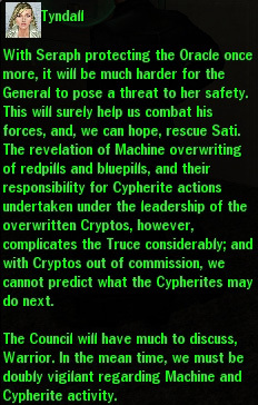 Zion Gunslinger I heard Seraph beat the snot out of him, ripped off his mask, glasses, and that stupid blue pill necklace he always wore, and then literally melted his brain. I sure as hell wish I could have been there to see that. Zion Upgrade Artist Nah, they say he was definitely still alive when he jacked out. But the Machines have heads rolling over this, you can bet on that. Aquatium There will be a need for answers, that's for sure. I went ahead to meet Niobe and Ghost. Niobe Now we know why Cryptos left Zion and started his Cypherite "sleep" crusade: the Machines got to him--overwrote him, like Smith did to Bane. He's been a *CENSORED* Machine all this time! It wasn't just him, either. Those other people Seraph's been hitting? Now we know why their memories were missing: they'd been overwritten, too. We're putting all Zion on alert. There could be more of these Machine spies anywhere. We can't afford to trust anyone. The Machines have been busy during this "truce" of ours. Aquatium This truce? hardly, they seem to be doing what they want, I think... Ghost We've got a situation. You're up, operative. Tyndall will brief you on the way. Niobe Get moving, Aquatium. Aquatium Got it.. Operatore, patch me the location details.