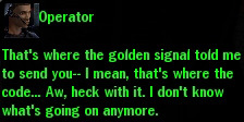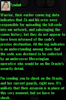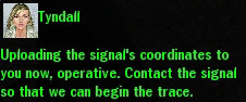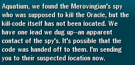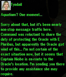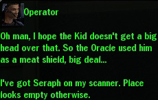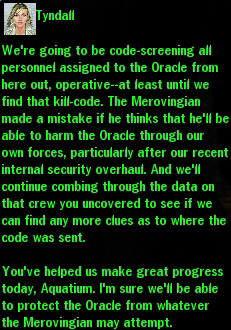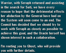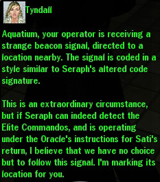 Seraph Your assistance is most welcome. Although I cannot see Sati's trail at this time, it is my hope that pursuing those I can see will bring us closer to her. So, we begin by searching for some of the General's commandos. Although we travel by different means, our paths will bring us together. The Oracle I am a little worried about Sati--she's never been away for this long before--but she's a tough kid; I think she'll pull through all right. If you really want to know, I'd say it's the General who's going to end up in a bad way if he doesn't change his tune. Aquatium We will all do what we can to bring her back safe and deal with The General. Seraph Your operator will guide you. Aquatium I left and recieved the locations I had to go to.