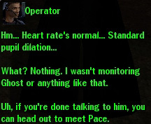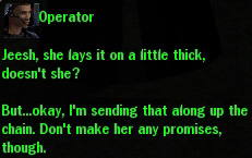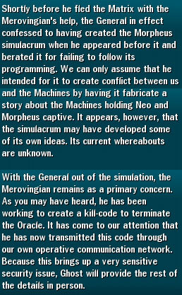 Agent Wong The Zion operative has arrived. Agent Pace Saluti, rossapillola. Of course, we are very concerned about these recent events, and we welcome the opportunity to clarify them for you. It goes almost without saying that we do not have either Morpheus or Neo in captivity, as has been alleged--allegations made with absolutely no supporting evidence, I might add. Those two men were, unfortunately, terminated by powerful rogue programs quite some time ago, as everyone knows. Secondariamente, concerning Cryptos, we must point out that overwriting of individual humans for security purposes is not prohibited by the agreed-upon Truce. We will continue to take what actions we deem necessary to ensure the continued stability of the System, and the safety of its inhabitants. Aquatium Well.. thank you, for that explination. Agent Pace Grazie, operatore. I am also authorized to inform you that our campaign against the exiled program The General continues to make good progress, despite support he has recently received from the Merovingian. We expect to eliminate the General and his Sentinel commandos as a threat in the near future. Aquatium I hope we hear more good news on that front, sooner rather than later, it is a threat concerning us all. I left the meeting and updated Tyndall.
