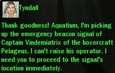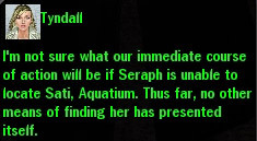 Aquatium We need answers Tyndall, this is not what the truce is about. Sati's return is still a main concern, we need to concentrate on that also, keep me posted. // Transmission Log End