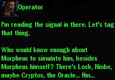 Aquatium I walked into a group of guards talking... Zion Upgrade Artist Okay, but why there? Why those people? Why such a cryptic message? What good is it gonna do? I'm just saying it doesn't quite add up. Zion Physician Why not there? And as for what he said--sure sounded exactly like the same old Morpheus I saw years ago. It's not like you can expect him to recite the Gettysburg Address while he's broadcasting on an emergency frequency! Geez. Anyway, he's always played it close to the vest--wouldn't have lived this long if he hadn't, would he? Hah! Zion Rifleman I heard he's got a fragment of some kind of code on him--binary. Maybe it's the key to this whole thing. Hm... Zion Physician I dunno about everyone else, but my crew and I are gonna be prepared, no matter what! Zion Upgrade Artist I always miss these things... Aquatium There were talking about the possible Morpheus sightings...