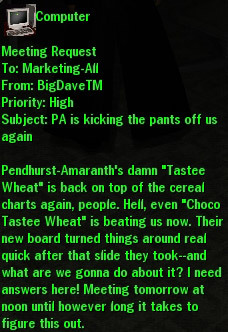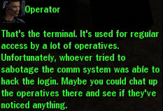Aquatium The main computer to search was locked and required an access key, didn't take me long to get that. Security Yah, yah, keep up the good work... Bluepill Hmm dee dmm... Do you know who I am... Because I don't know myself... Hm hm-mm hmm... Colin Lange Something's wrong with my computer. It won't give me access! How am I supposed to finish that report? Where's IS when you need them? I swear that Dewey hides from me... Dewey Hoyos I've got like fifty billion things I'm working on right now. We've got an online work request system, you know. Use it. Aquatium Sure thing..., the information from some of the computers was certainly... interesting.