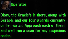 The Oracle Well, look who showed up, huh? He's a little mussed from that dunking they gave him, but that's still my Seraph. Aquatium I am releaved to see him back at your side Oracle. The Oracle Aw, I'm glad to see you both. Now, who wants a hug? Aquatium I could use a cookie. Seraph All is in its proper place now. Apologies for my late arrival. Thank you for protecting the Oracle. I do not understand it, but...in the river, I felt code flowing through me. Everything went dark... Much time must have passed. I felt myself rising. I came to the surface, and pulled myself out. There were people there... I realized that I could...see a foreign presence in one of their minds--a Machine program. And I could reach it--pull it out. It has been much work, but I have removed all such programs I could find in the city. Aquatium Well... then I'm sorry if anyone doubted what you were doing Seraph. After we heard what happened at the river, and then what the Merovingian was saying, we feared the worst. The Oracle Seraph's a tough cookie; he's been around a long time, you know. Yeah, the cheat codes in that river did a number on him, but I have a feeling he'll be all right. Ooh, but come to that, what am I standing around jawing for? I've got cookies to bake. Seraph I know that...my mind has been clouded. I feel it begin to clear at last. Perhaps the effects of the code are wearing off. I must remain, and protect the Oracle. Aquatium Good to hear. We all know she is back in safe hands.