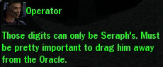 // Transmission Log Entered Aquatium I was investigating further into what has happened when there was a sighting of Seraph, I along with others tried to question him but he gave few answers and didn't stick around long enough to get more from him. However the Oracle herself asked us to believe in what he is doing, even though what it was is unclear. Not long after I went to speak with more people that had been attacked as such by Seraph.
