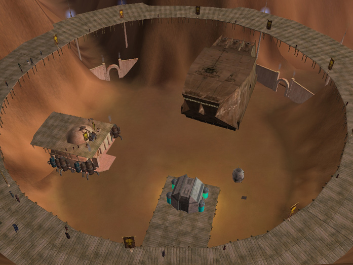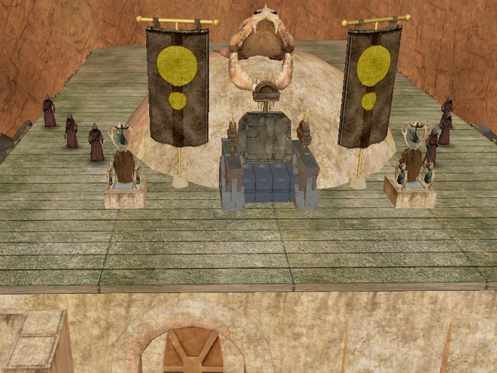 Guild 2 vs 2 tournament arena- an outcast tusken warlord calls upon my guild to demonstrate combat techniques for his cloned army of genetically engineered fighting jawas. the winning pair from each fight had the honor of sitting at the smaller thrones to his left and right.: